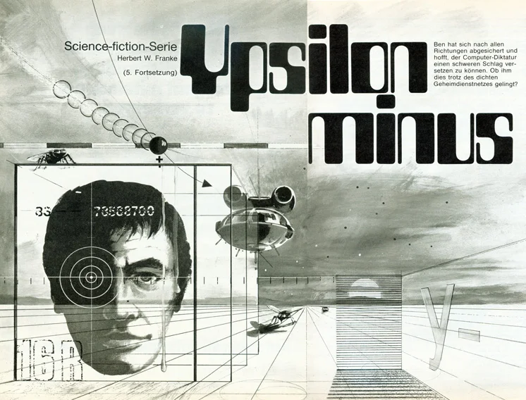 Но не все прогнозы сбываются: вторая половина двадцатого века оказалась, по большому счёту, началом эпохи цифровой программируемой электроники, исподволь используемой как инструментарий сильных мира сего, а не героической эрой освоения межзвёздных пространств. Компьютерные технологии будущего виделись крупным литераторам отнюдь не в радужном цвете. И иллюстрации Клауса Бюргле к произведению Герберта Франке (Herbert W. Franke) "Игрек минус" (“Ypsilon minus”) передают нам тревогу и предупреждения великих художников.