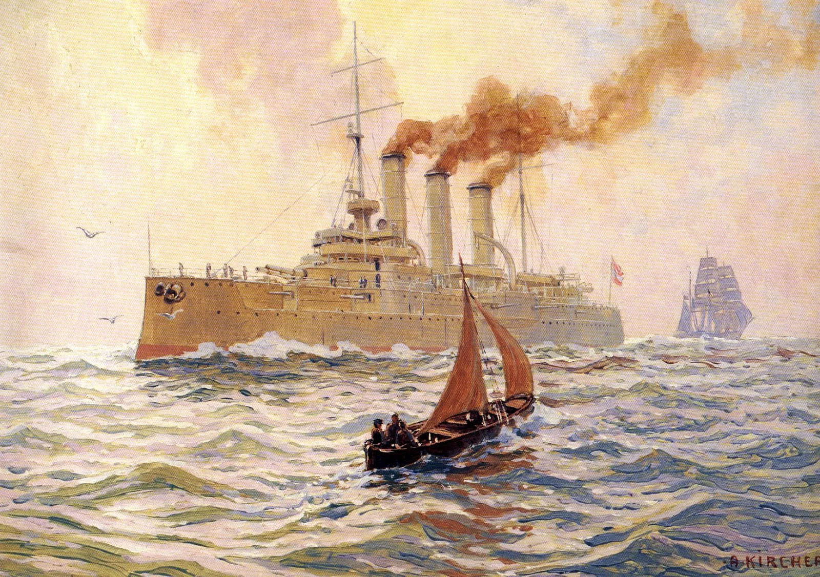 Александр Кирхер (Alexander Kircher; 1867-1939) - австро-венгерский и немецкий художник-маринист, пейзажист и иллюстратор. Родился в Триесте; окончил Берлинскую академию искусств; с 1895 по 1900 год преподавал в Академии художеств в Триесте; в 1904 – переехал в Вену, затем в Дрезден, позже - в Морицбург, где жил в Кётцшенброде (Kötzschenbroda-Niederlößnitz) на вилле Циллерталь; работал в качестве иллюстратора в престижных издательствах Вены, Берлина, Лейпцига; автор почтовых и художественных открыток. Живописные полотна художника находятся в постоянной экспозиции в Музее военной истории (Heeresgeschichtlichen Museum) в Вене и в Морском музее Сплита (Pomorski muzej).