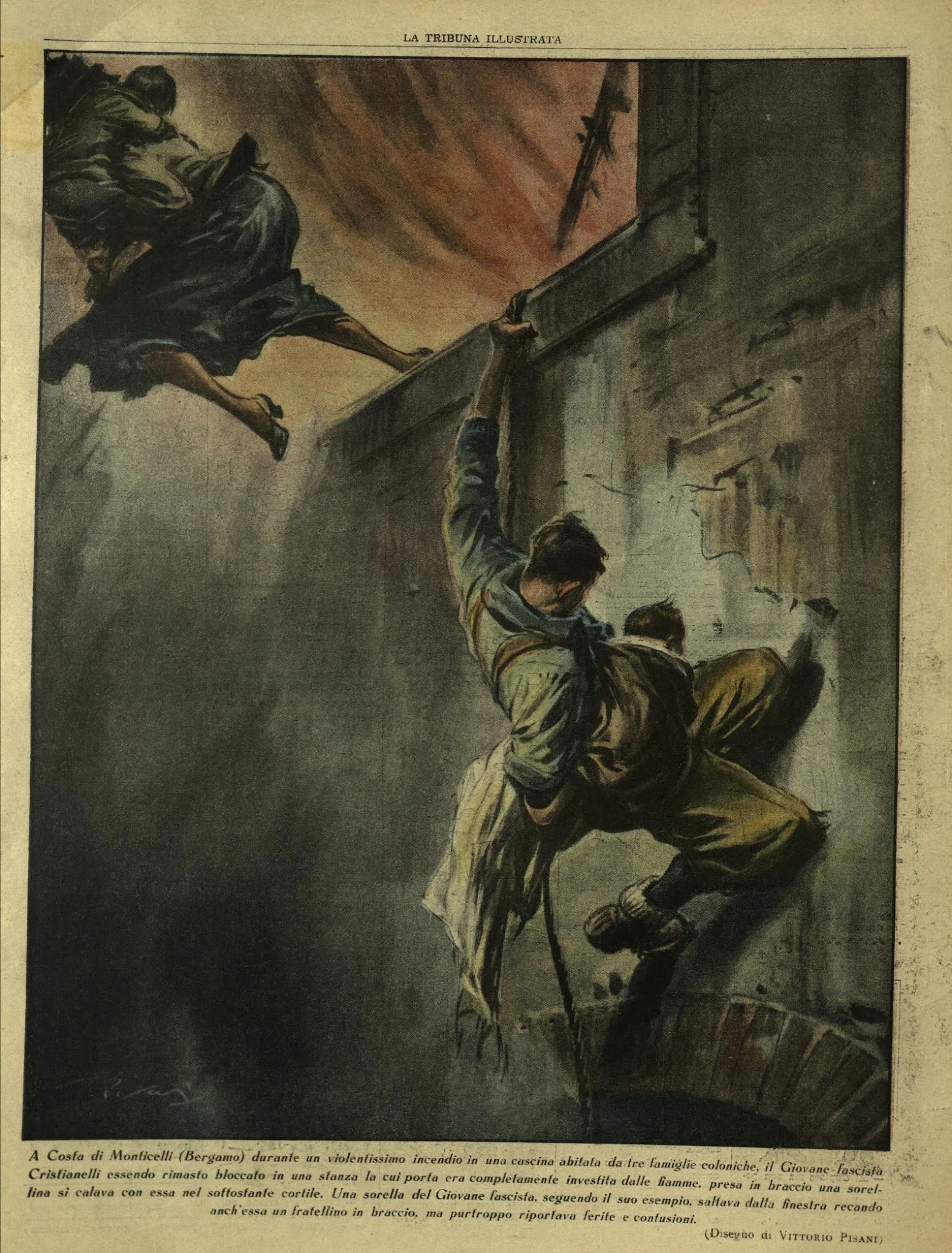 Vittorio Pisani (1899-1974) was a Greek-Italian painter and illustrator. He was the author of the famous covers of the weekly "La Tribuna illustrata". He graduated from the Roman Academy of Fine Arts (Accademia di belle arti di Roma). Vittorio Pisani, inheriting the established structure of Italian illustration, nevertheless not only visualizes a separate situation in its seemingly inevitable static character, but also kinematically links all the elements of the drama together, giving the displayed event a special liveliness.